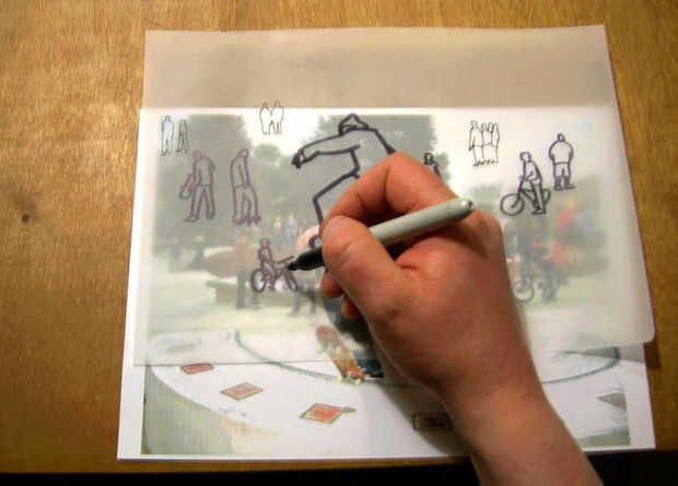 Seguimiento de las personas u objetos (árboles, muebles, vehículos, etc.) que desea que aparezca en la imagen final, moviendo el papel para dar a cada uno de ellos algo de espacio en la hoja. Utilice el lápiz grueso para las figuras más grandes, la pluma mediana para figuras en la media distancia y la fina pluma de las figuras más pequeñas. Esto significa que podemos ampliar o reducir nuestras cifras en los pasos más adelante sin el peso de línea que aparecen variar demasiado.