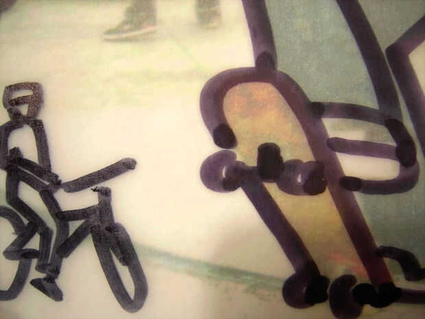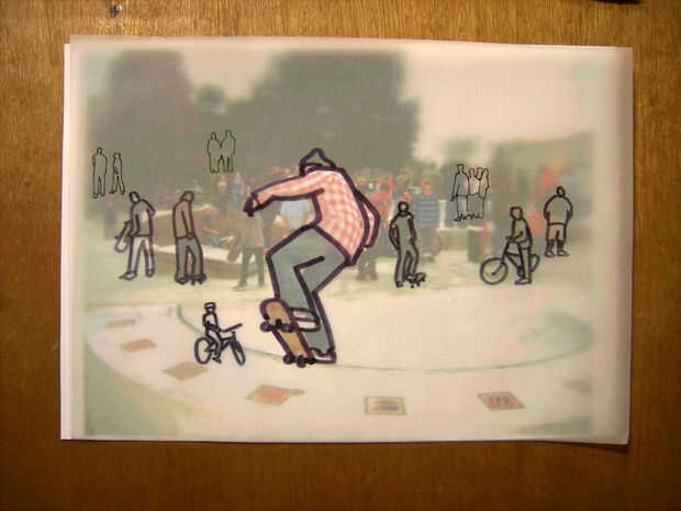 Ayuda a localizar una foto de la actividad que desee mientras la gente sería más convincente. Podrían rastrear personas de catálogos de moda por ejemplo, pero solo en silueta sean reconocibles como modelos en lugar de personas reales. En este caso me di cuenta de a cuantas personas en un parque de skate soporte alrededor mirando sus zapatos o tableros con la cabeza inclinada.