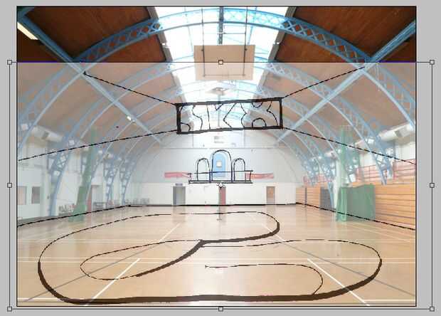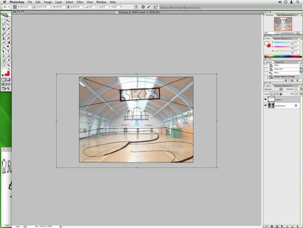 4. Use Editar > Transformar > escala, ajuste el tamaño y posición del esbozo del fondo para que coincida con la foto del sitio (Fotografía 3)