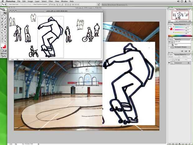 1. trabajo con el marco de dibujos de personas, use la herramienta seleccionar para aislar a una persona/cosa o grupo de artículos. Utilice la herramienta mover para arrastrar y colocar esto en la imagen de su sitio. Una vez más, se creará una nueva capa para su inserción, y será probablemente la escala equivocada y posición. (cuadro 1)