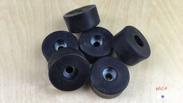 Inserte un tornillo de máquina de 1/4"-20 en el pie de goma premoldeados. Añadir una fender arandela y tuerca de nylon. Apriete la tuerca, la arandela de defensa en lugar de bloqueo.