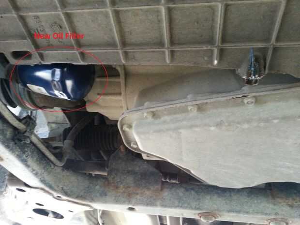 Ahora se reemplazar el filtro de aceite con una nueva que compraste. Antes de enhebrar en, es una buena idea para difundir algunos de aceite nuevo alrededor del anillo de junta. Esto ayudará a sellar correctamente y no escape. Ahora con cuidado enrosque en y gírelo hasta que la Junta toque. Debe decir en el filtro cuánto apretar después de este punto. Es generalmente cerca de 1/2 vuelta después de la Junta de la toca, pero podría ser un poco más o menos. No lo deje demasiado flojo como podría vibrar, causando daños catastróficos a su motor cuando se drena el aceite.
