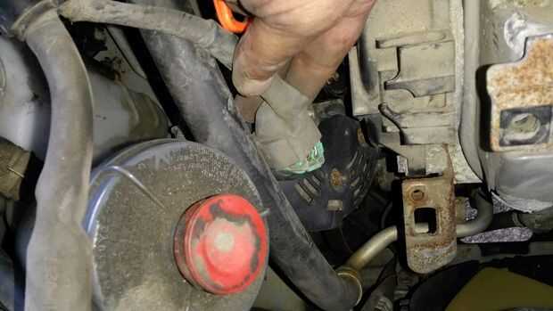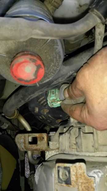 Usted tendrá que girar el alternador para que la parte trasera se enfrenta al cableado. Retire la tuerca de 12 mm para el cable de la batería y accionar el pestillo en el otro terminal grupo (verde) para liberarlo. Batería