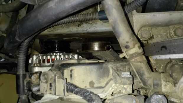Ahora empuje la herramienta tensor hacia el firewall hasta que se detenga y resbalón de la correa del alternador. La tentación es anteponer la correa en el alternador y luego deslizarla sobre el tensor. Puede trabajar para usted, pero no funcionó para mí. No tengo suficiente tiro con la herramienta tensor para hacerlo de esa manera. Así que lo pongo en el alternador última.