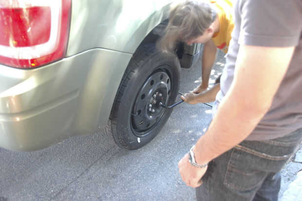 Arreglar un pinchazo - el camino fácil del neumático con un compresor de mini en el maletero del coche