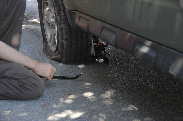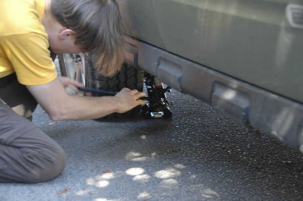 Asegúrese de que su amigo comprueba que el freno de estacionamiento y establece una cuña frente a los otros neumáticos por lo que el coche no rodando. Que lo mire el diagrama en el manual del propietario para determinar que puntos en el marco son lo suficientemente sólidas para colocar al gato debajo.