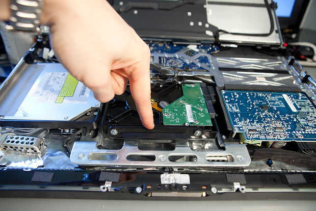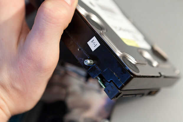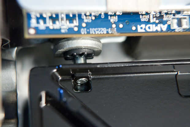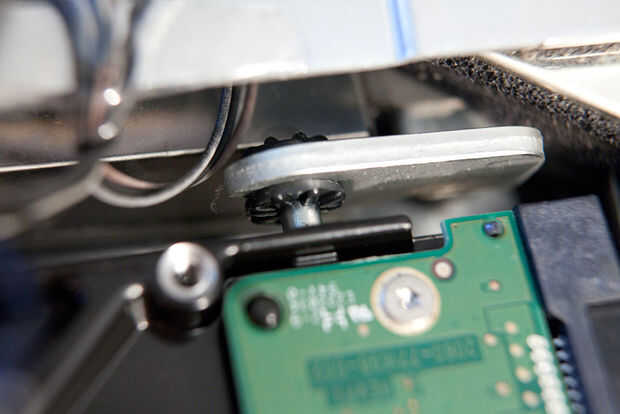 Usted debe tener ahora un total de 24 tornillos ahí: 12 de marco, 8 de la pantalla y 4 de la unidad. Hay además el identificador para el disco duro y el clip de colocación de plástico negro para el sensor de temperatura.