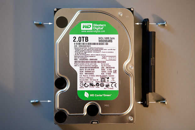Ahora saque el disco nuevo y poner los tornillos en los mismos lugares donde habían estado en la unidad vieja antes. El mango se va a la derecha.
