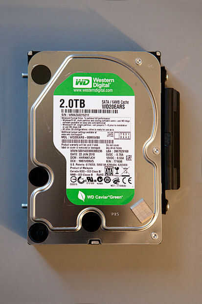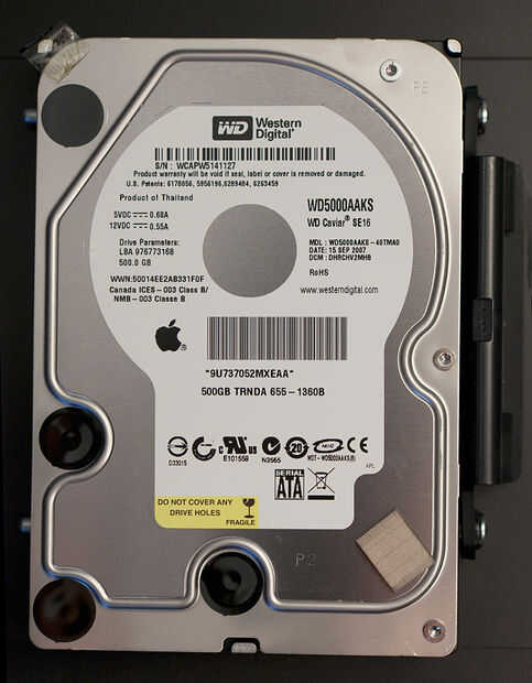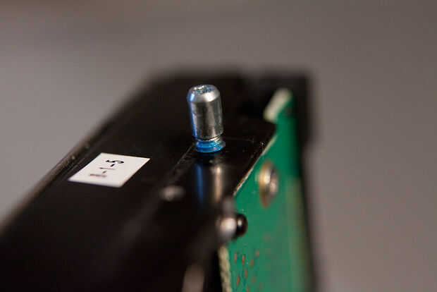 Sin embargo, no hemos terminado enroscar alrededor de (valga la redundancia no). El disco duro aún tiene dos tornillos en un lado y el mango negro por el otro, también sujeta con dos tornillos. A pesar de mi primera Asunción, todos ellos son tornillos T8 que se deben deshacer. Los del lado izquierdo tienen una marca azul. No sé por qué pero supongo que podría ser un medio de confirmación de violación de garantía ;)
