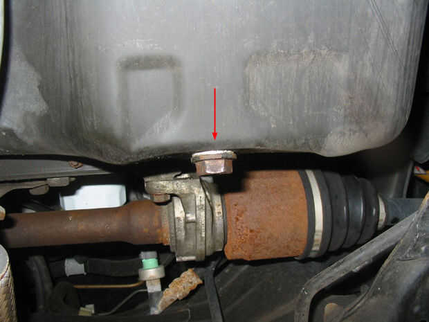 Encontrar la ubicación correcta del filtro de aceite y tapón de drenaje es el siguiente paso. Por control manual o en la imagen de abajo, es fácil localizar el lugar. Poner la cacerola de aceite bajo esa ubicación unos 4 a 6 pulgadas del agujero, ya que el aceite puede disparar hacia fuera. Antes de extraer el dren del enchufe, guantes de protección son esenciales para usar para proteger sus manos. Además, no cae tapón de drenaje en el cárter de aceite, de lo contrario es difícil encontrar en el líquido sucio, pegajoso, sucio, negro. Afloje el tapón con llave de tamaño adecuada (sentido antihorario). No olvides poner y firmemente el tapón.