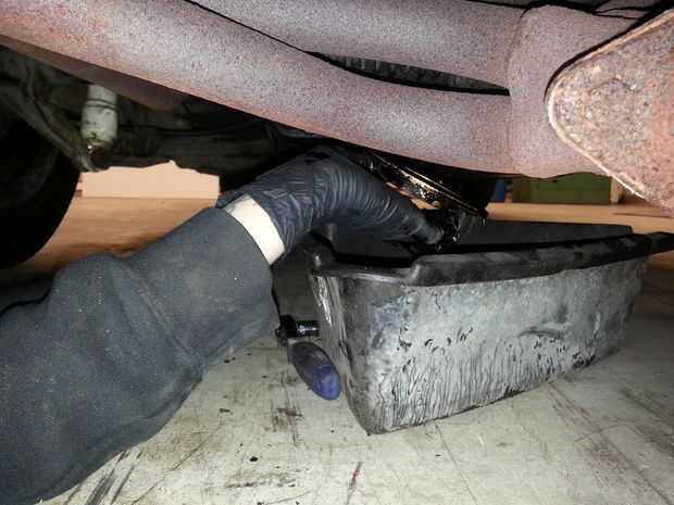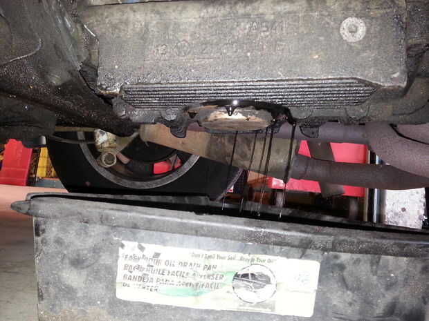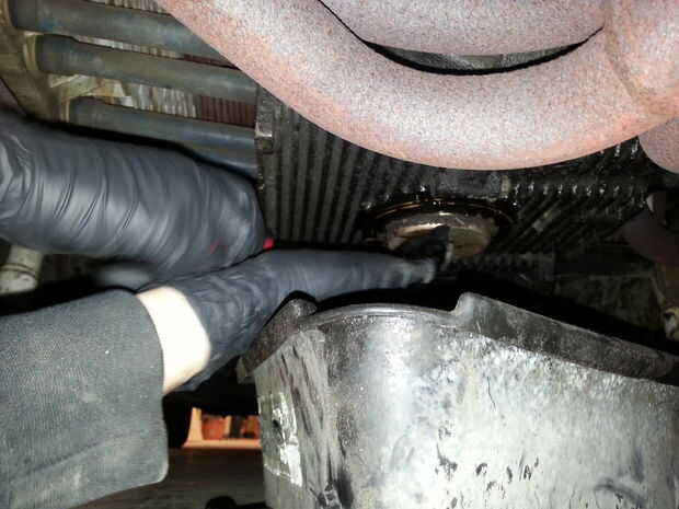 a continuación encuentra el tapón del cárter de aceite y aflojado para dejar algunos drenaje de aceite. Después de dejarla escurrir un poco, he quitado el tapón y la empaquetadura completamente y luego limpió. Entonces dejé el aceite drene completamente antes de cambiar la Junta y enchufe.