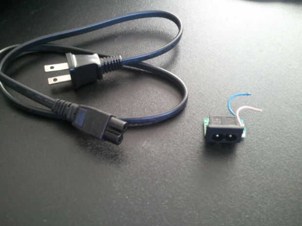 Lo que quiero hacer es cortar el cordón y sustituir el conector para que pueda salir un cable conectado a mi montura y mantenga la otra mano que puedo tomar para la casa de mis padres. He encontrado un conector en un viejo portátil transformador de ladrillo. Tomó un poco de trabajo y un gran martillo pero salí el conector y estoy listo para poner en mi TV.