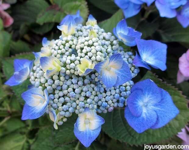Una hydrangea Teller azul hermoso. Como se puede ver borrosa en los bordes, algunas de las flores son color rosa lavanda.