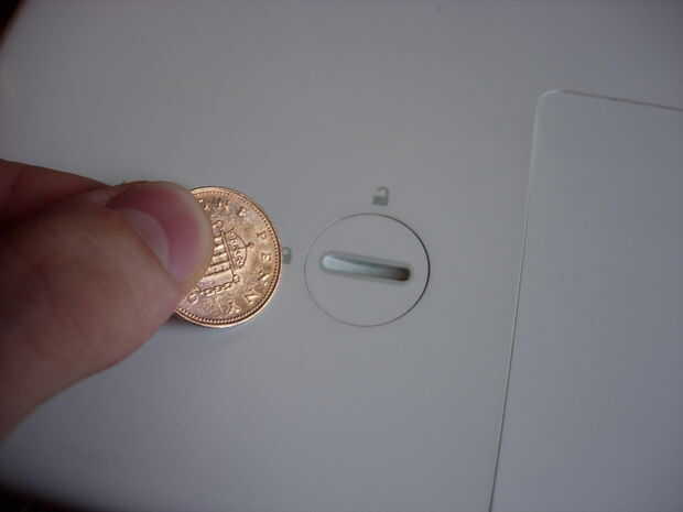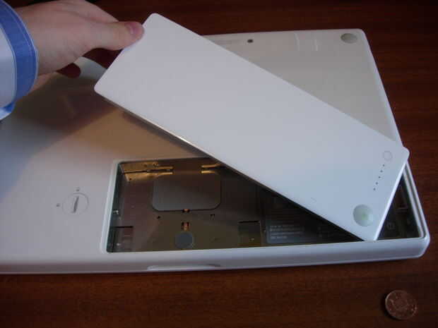 El disco duro, así como la memoria RAM se encuentra detrás de la batería de tu MacBook. Voltear al bebé y utilizar un centavo para girar la cerradura y luego sacar la batería.