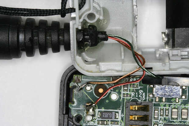 Como se puede ver, el conector hembra de la línea se corta y despojado cuidadosamente pasado el alivio de tensión para exponer una longitud corta de cable. Los cables deben ser lo suficientemente justo para hacerla conveniente permanecer disimulada, como se muestra.