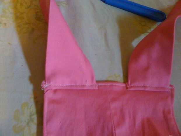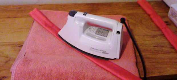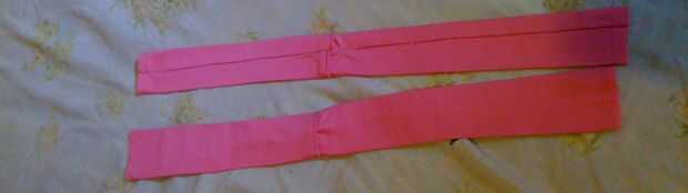Después de liberar los tirantes, cortar aproximadamente dos pulgadas debajo de la línea que marcó. Asegúrese de que las tiras estén aún. Doblar las tiras por la mitad con el revés contra revés hacia afuera y coser el borde. Terminarás con un tubo que daremos vuelta adentro hacia fuera. Plánchelos con la costura en el centro de un lado.