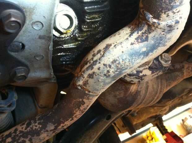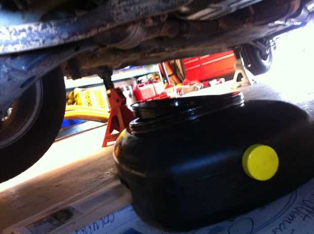 Ahora coloque la noticias documentos y líquido recolector bajo el diferencial. La diferencia es entre el escape y el sub-frame. Tiene aletas en el exterior (otra vez, no te confundas y drenar la transmisión, que tiene una bandeja con un montón de tornillos alrededor del perímetro y está en el lado del conductor).