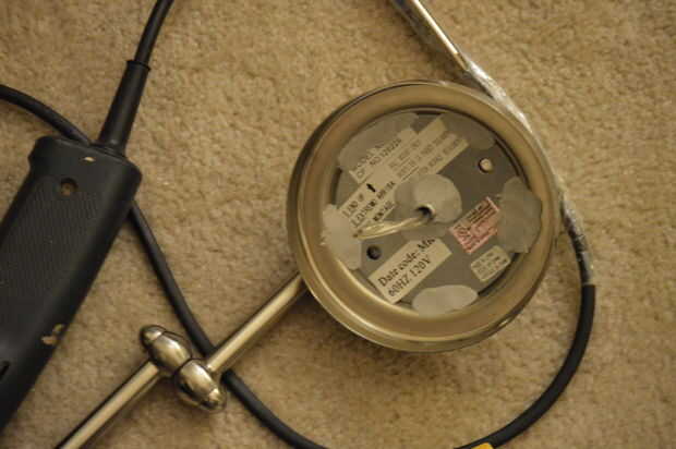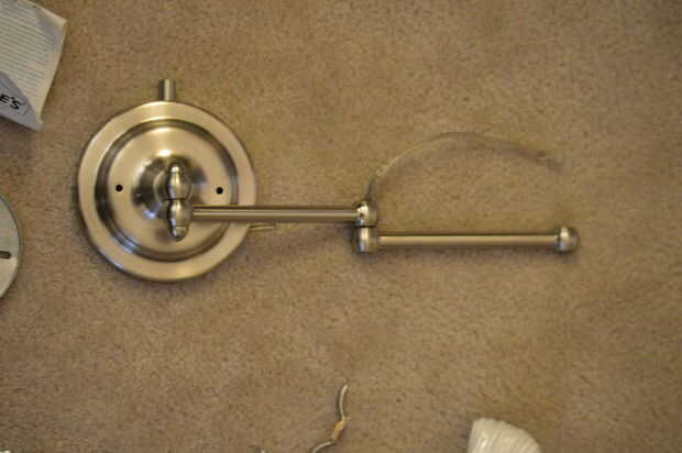 Primero quité la toma de luz, y es lujo vivienda pequeña del extremo del brazo de la lámpara de pared. (lo sentimos, no hay fotos de eso, sino que literalmente sólo desenroscar del brazo, hacia la izquierda. Luego cortar los cables fuera y saque el cable. (no necesita remover el cable si es demasiado dura desenroscarlo de la lámpara. Usted puede simplemente cortar el las partes visibles y la broca en el extremo donde posteriormente pondras la polea.)