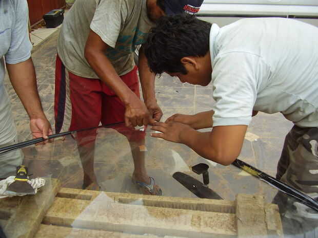 Fije el viejo espejo en el punto negro del parabrisas nuevo. Limpiar bien ambas superficies.   Utilizar pegamento epoxi, 10-20 minutos para secar.
