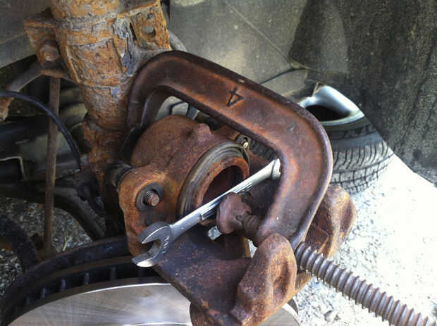 Ahora por supuesto, ya que el rotor es nuevo, es más gruesa. Las pastillas son nuevas, son más gruesas. ¿Cómo obtengo la pinza para caber otra vez? Tienes que comprimir el pistón en el cuerpo del calibrador.
