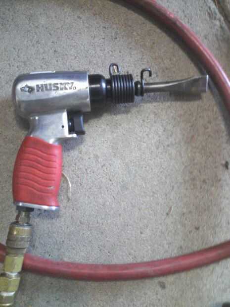 1: quitar los remaches/tornillos de la articulación superior. Usé un impacto martillo y cincel para hacer el trabajo de los remaches. Se trabajará un cincel y un martillo. Una antorcha, cortador del plasma, corte de la rueda, etc. también trabajará. Si con una antorcha o plasma, coloque un trozo de chapa sobre sus líneas para que cualquier metal fundido no toca las líneas.