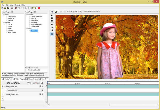 Por último, tenemos que montar todo. En cera, cargué tanto vídeos en la carpeta de medios y luego los arrastró en área de línea de tiempo. Después de arrastró el plugin de Chroma Key de la pestaña de Plugins de Video a la pista de video de primer plano.