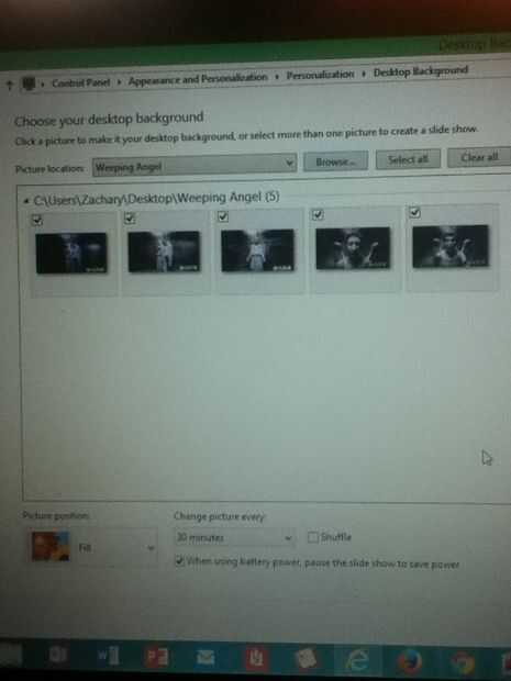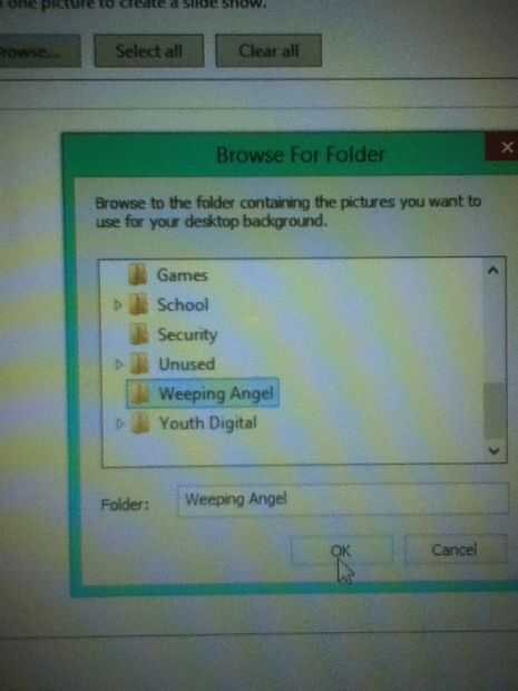 Go to settings. Haz clic en personalización y vaya a la página del tema. En tu fondo de pantalla, haga clic en examinar. Navegar por el escritorio y haga clic en Angel llorando. Si no seleccionaron todas las fotografías, continuación, seleccione todos y haga clic en guardar.