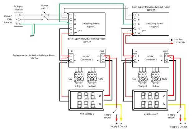 Conmutación de alimentación 1 y 2 es energizados y desenergizados a través de un interruptor de encendido iluminado DPST. Estas fuentes proporcionan la constante 24V DC requeridas para ventilador de 1 y 2, el enfriamiento de convertidores DC-DC y el V / muestra. Convertidores DC-DC 1 y 2 proporcionan salida controlada de voltaje y corriente a la fuente de poder vinculante puestos.