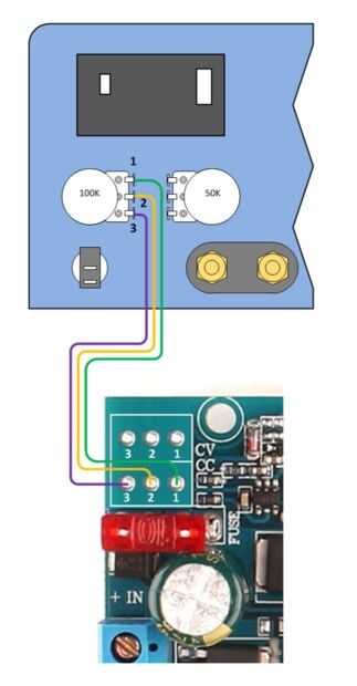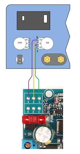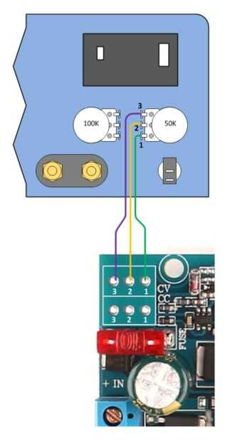 4. soldadura CC conduce de DC-DC convertidor 2 a la K 100 actual ajuste potenciómetro. La soldadura de pernos de 1 a 3 en el PCB del convertidor DC-DC a los pines 1 a 3 sobre el potenciómetro como se ilustra arriba.