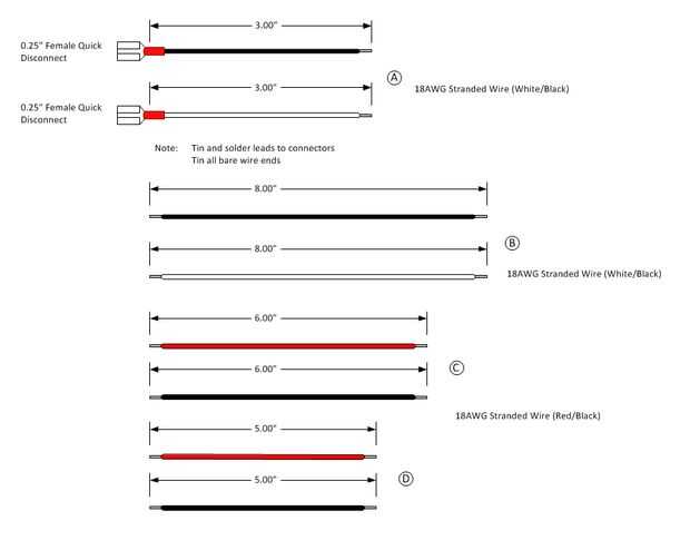 3. construir cables A, B, C y D como se indica en el diagrama anterior. Tira 1/4" aislamiento en ambos extremos de cada cable. Todos los conectores de la soldadura y los extremos de hilo desnudo de la lata.