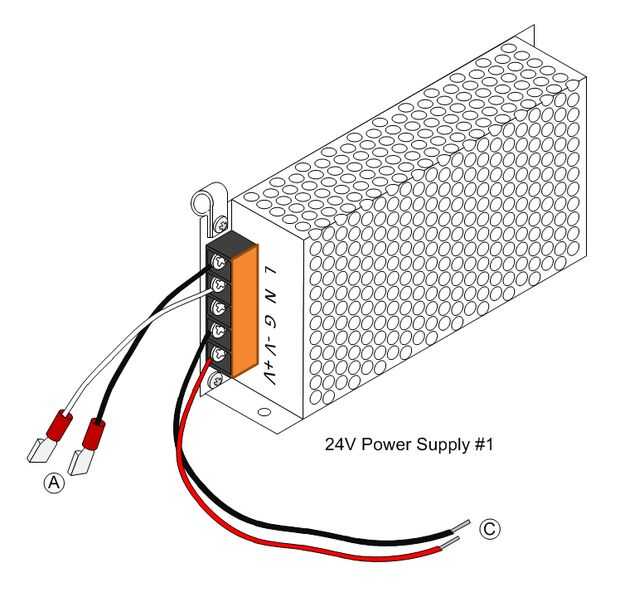 4. Conecte los cables A y C a 24V poder suministrar 1 como se indica en la ilustración de arriba. El cable negro del cable A se conecta al tornillo de barrera marcado "L". El alambre blanco del cable A se conecta al tornillo de barrera marcado ' n '. El cable negro del cable de C conecta con el tornillo de la barrera marcado '-V'. El cable rojo del cable de C conecta con el tornillo de la barrera marcado '+ V'.