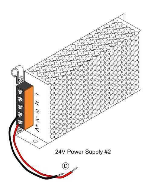 5. Conecte el cable D al suministro de alimentación de 24V 2 como se indica en la ilustración de arriba. El cable negro del cable D conecta con el tornillo de la barrera marcado '-V'. El cable rojo del cable D conecta con el tornillo de la barrera marcado '+ V'.
