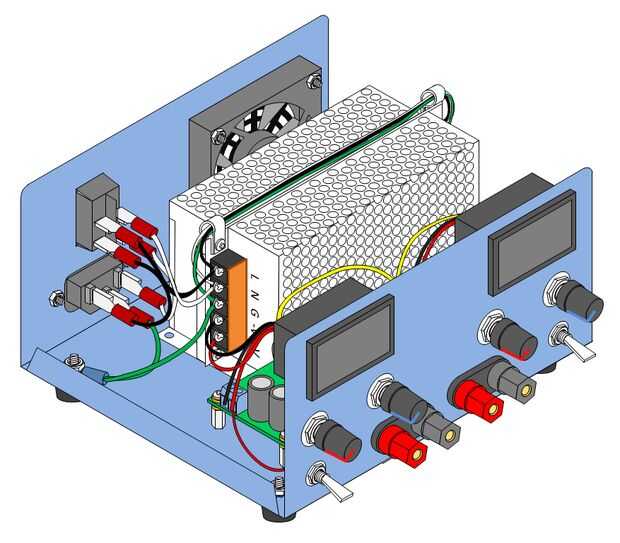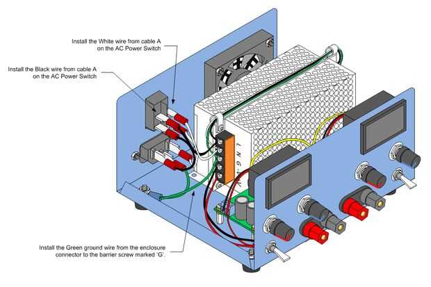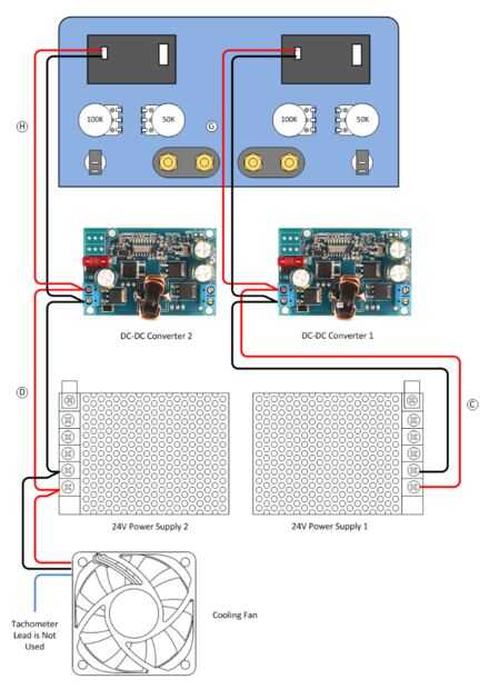 6. Conecte el cable del ventilador de refrigeración para suministro de alimentación de 24V 2 como se muestra en el diagrama anterior. El cable rojo se conecta al tornillo de barrera marcado '+ V' en el suministro de alimentación de 24V 2. El cable negro se conecta a la '-V' tornillo de barrera en el suministro de alimentación de 24V 2. No se utiliza el cable de tacómetro de enfriamiento ventilador azul.
