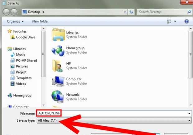 • Ir a archivo--> Guardar como--> el nombre autorun.inf y guárdelo en la raíz de la unidad USB
