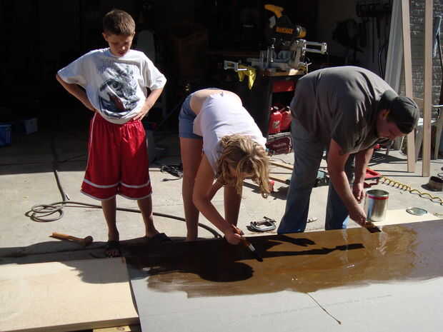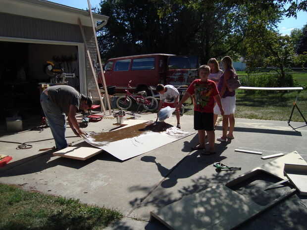 Esto es un poco complicado y para novatos te la va a necesitar varios "palos sissy" son un montón de palos sobre el mismo diámetro para poner encima de la encimera pegada espaciado uniformemente y un poco de cerca... Esto va a permitir diseñar el laminado (pegamento hacia abajo) encima de la encimera (pegamento hacia arriba) sin las dos piezas tocando.