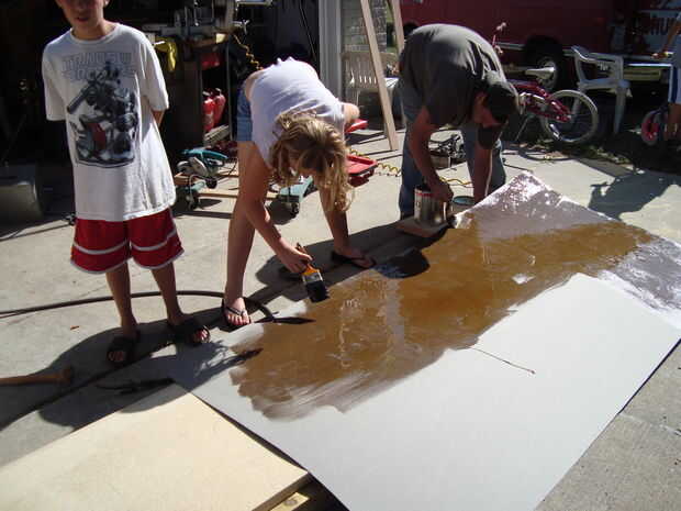Empiezo por verter una pequeña cantidad directamente sobre la superficie de la encimera y la parte inferior de la lámina. Hacerlo en pequeñas cantidades por toda la encimera donde sea necesario. Tienes que trabajar rápido pero también se necesita para asegurarse de que se están extendiendo uniformemente. Sería la mejor manera de rociar en, pero esto no era una opción para mí. Así que lo pinté en rodillos y cepillos... Una vez que cubra ambas piezas, deje que se seque... Ellos realmente no deben ser pegajosas al tacto.