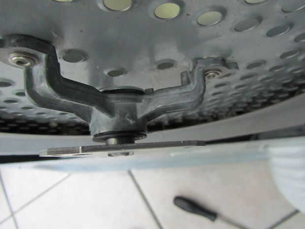 tiempo para reinstalar el nuevo bush-i tuvo algunos problemas debido principalmente a hacer el trabajo alone.first empujé el bush-envuelto en ptfe-en el agujero del soporte, después me deslicé el eje de la placa triangular en el Monte, luego tienes que poner una arandela de nylon (plástico) en el eje sobresale el lado lejano de la selva, es la arandela de metal y tapper.the del uno mismo auto recolector tiene que ser objeto de burlas en el agujero y apretó para arriba desde dentro el tambor-obviamente el eje rota así que tienes que fijarlo otra vez i encuentra la arandela de plástico tiende a 'bajar' el eje así que pellizcar entre la arandela de metal y el extremo del eje si su cuidado no- y no 3 veces! al final que debe ser la arandela de metal duro con el fin del eje y la arandela de nylon libre flotante en el eje-it tiene un dedo parando va 360 grados pero como dije antes que todavía se siente un poco descuidado tho. En la última foto se aprietan ambos tornillos indicados de dentro del tambor