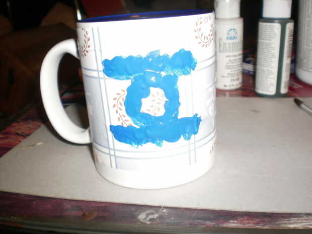 Una vez que la plantilla estaba en la Copa, pinté cautelosamente el área expuesta, untar algo entonces "cepillado" para que no sale nada en la plantilla.