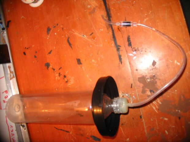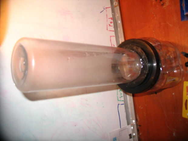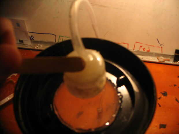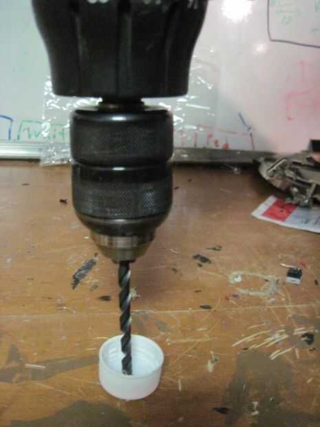 Primero necesita perforar algunos agujeros, uno en la tapa o el fondo del tubo para el tubo de aire caber en un poco más pequeño que el tubo de aire (punta, si el agujero en la tapa puede intentar por el lado para evitar fugas. Y ahora uno en la parte superior, se desea que éste tipo de pequeño, si la haces demasiado grande se ruidoso como el aire empuja hacia fuera. A continuación deberás mezclar el epoxi, direcciones están en la parte posterior del paquete. Ahora comience a impermeabilizar la tapa y todo el camino alrededor del tubo, no pongas agua en hasta que el epoxi haya secado por completo. Ahora corte un orificio en la tapa de la base de la botella ir y caliente pegamento epoxy allí.
