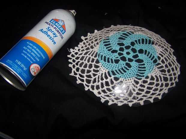 Fijar su cordón o doillie en la parte posterior de su placa con spray adhesivo.  Asegúrese de que todos los encajes se pega abajo y no existen áreas sueltas de que sangrará la pintura a través.