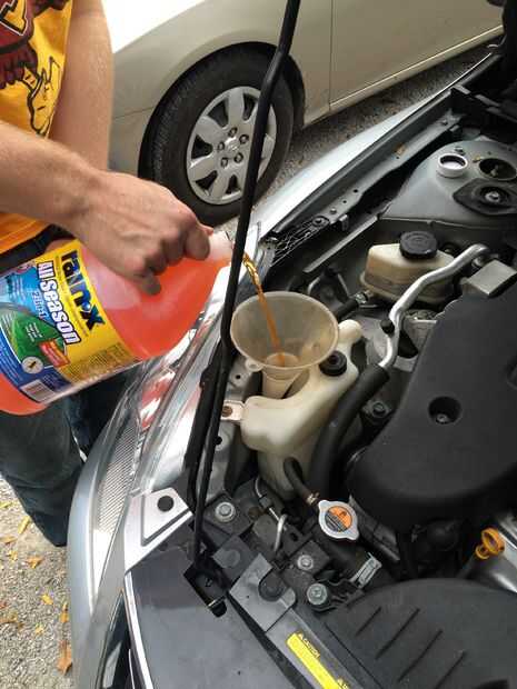 Busca la tapa de líquido de limpiaparabrisas de parabrisas. La tapa debe asemejarse a la que se muestra en la imagen. Cuando encuentre la tapa de quitarlo. Esto abrirá el depósito del líquido de limpia parabrisas que es donde se vierte el líquido en. Usted puede elegir utilizar un embudo o sólo viértalo directamente en. En este caso se colocó un embudo sobre la abertura. De cualquier manera que usted eligió para hacerlo, simplemente Vierta el líquido en el tanque lentamente hasta que comience a verlo llegar a la cima. Trate de no tener el líquido verter todo, pero si esto ocurre no es otra cosa a destacar acerca de.