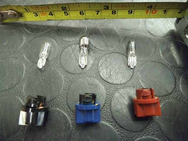 Bulbos del reemplazo están disponibles en línea, busque "#74" (esto se refiere a su tamaño). Recomiendo LED, ya que durarán más que el coche. Para color blanco natural, no fresco blanco u otros colores. Otros colores no se mostrará a través de correctamente porque los medidores ya tienen color verde y rojo.