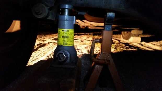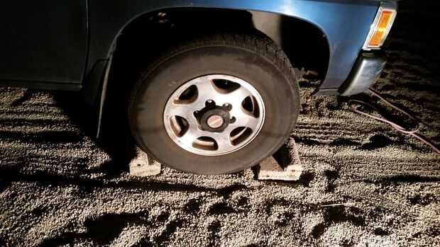 Calce las ruedas para evitar que el vehículo ruede. Usé 2 ladrillos de paisajismo que tenía y una de las ruedas delanteras bloqueadas porque la reparación iba a ser en la parte posterior. También tenga en cuenta que frenos de estacionamiento tienden a bloquear sólo la parte trasera y que estaba trabajando allí no se aplicó el freno de estacionamiento, no sé si afectaría pero no quería ninguna interferencia. Si está trabajando en los frenos delanteros recomendaría mantener el freno de estacionamiento en.