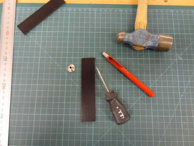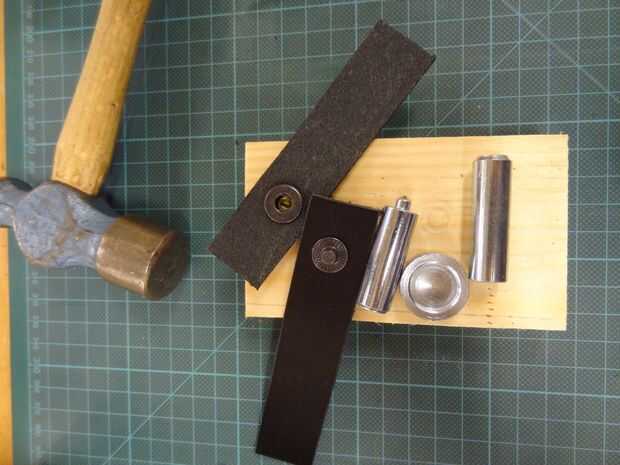 Hacer un agujero. Utilicé una herramienta hueco. También puede perforar con un taladro o usar o perforar un agujero de cuero. Los dependientes del tamaño de los sujetadores de la prensa