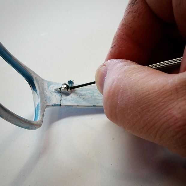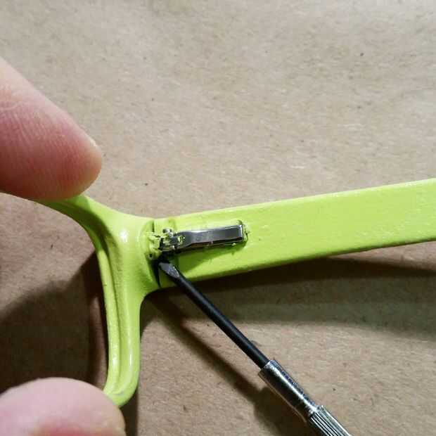 Después de la última capa se seque durante unas horas, coge el destornillador joyeros/óptico. Utilizando el borde de la hoja del destornillador también ahora puede eliminar las pequeñas cantidades de pegamento alrededor de las bisagras para revelar el metal.