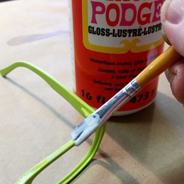 Momento de aplicar el Mod Podge. Prefiero el acabado super brillo. Aplicar suavemente con movimientos incluso usando un cepillo pequeño. Aplique 3 capas aparte unos 20 minutos debe proporcionar un buen acabado. Tratar de evitar llegar a mucho Mod Podge en el surco interno de sus marcos. Esto hará más difícil de insertar sus lentes.