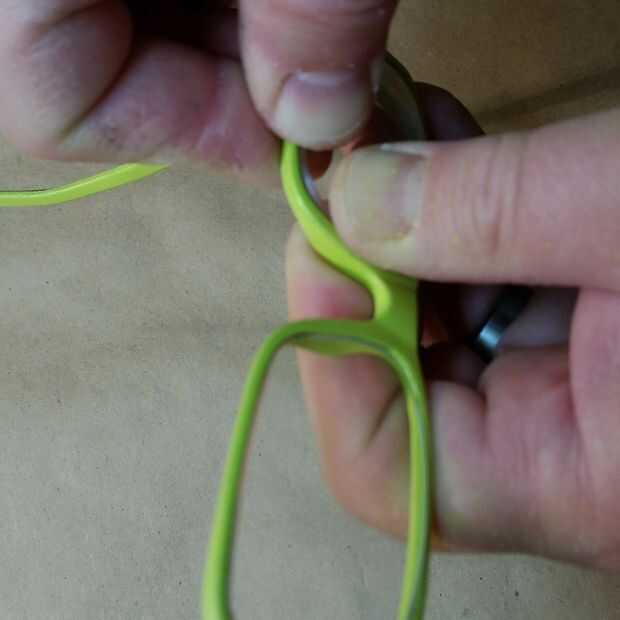 Hemos casi terminado. Tomar sus lentes. A partir de la lente derecha, inserte borde exterior superior de su lente la correspondiente arboleda fuera de su marco.