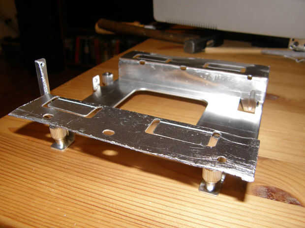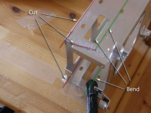 Los lados de la jaula tienen que ser doblado abierta para utilizar como mesa para el recinto de 5,25 pulgadas de alta definición. La altura de la inclinación es importante: Si va demasiado bajo, es molestar a las partes de la mainboard de Thecus; Si curva demasiado, el HD no va a caber en el 1541. El extremo superior de los orificios de montaje para el HD inferior marca la altura correcta.