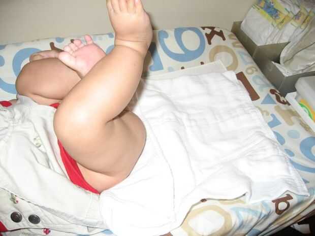 Poner el pañal en el bebé. Doblar el borde izquierdo del pañal para que cerca de un tercio del pañal está en bollos del bebé. La parte previamente doblada del pañal debe ejecutar izquierda a derecha delante de usted, para que quede óptimo para absorber el pipí y caca.