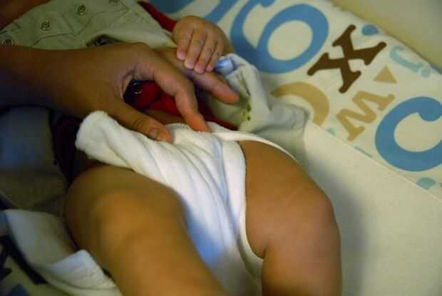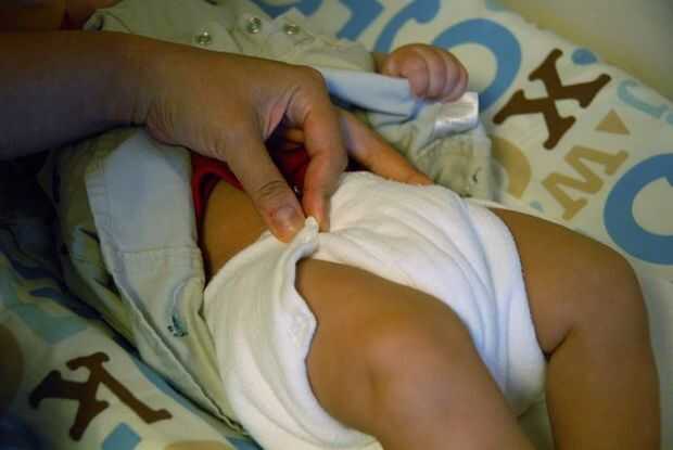 Paso 6: Envuelva el pañal en las piernas del bebé.